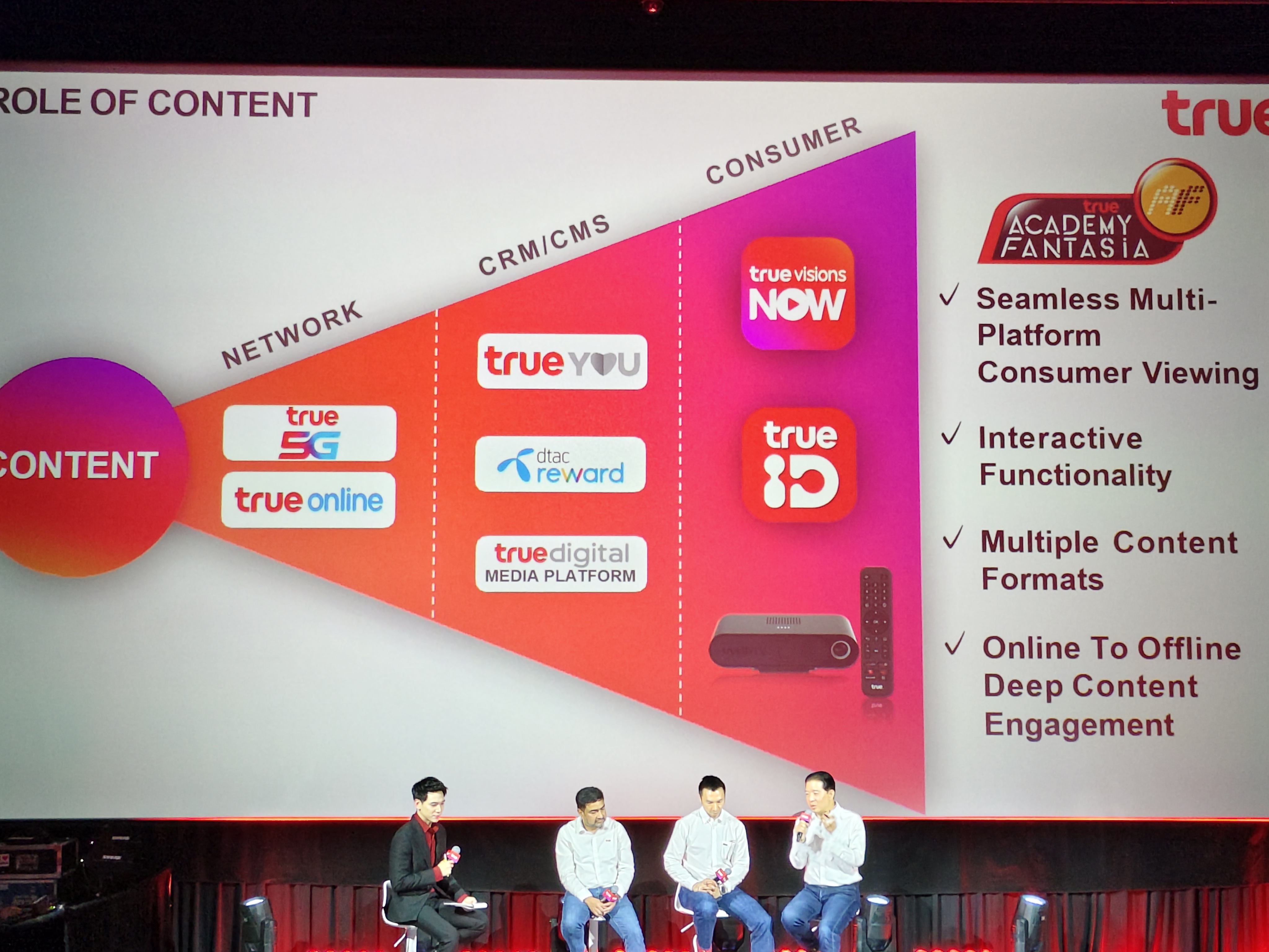 พีรธน เกษมศรี ณ อยุธยา ระบุว่าในมิติด้าน Content และ Media ทรูได้ฝัง AI ลงในระบบ CMS และ CRM เพื่อสร้างประสบการณ์การนำเสนอคอนเทนต์และสิทธิประโยชน์ (Privileges) แบบ Hyper-Personalization ที่ตรงตามไลฟ์สไตล์ของแต่ละบุคคล พร้อมทั้งข่าวดีเรื่องการกลับมาของรายการในตำนานอย่าง True Academy Fantasia (AF) ที่จะมาในรูปแบบ Multi-platform และมีฟีเจอร์ Interactive มากขึ้นในอีก 2 เดือนข้างหน้า