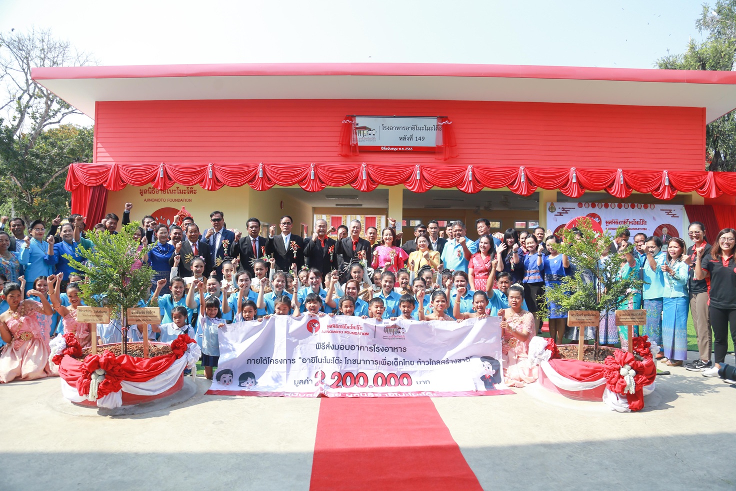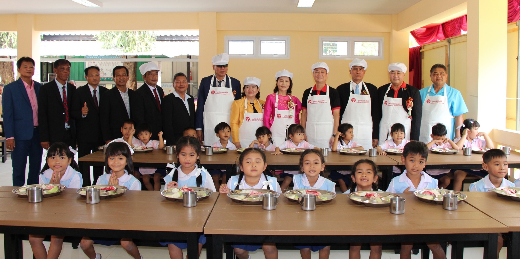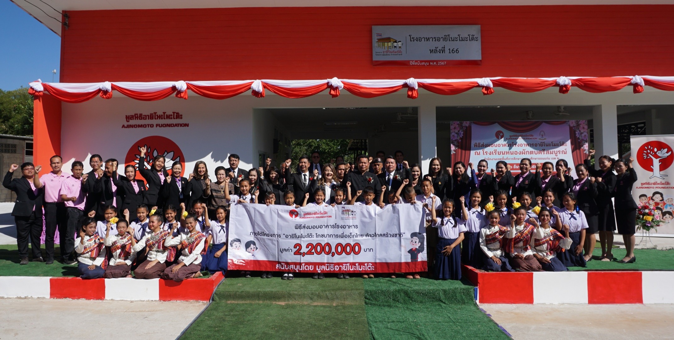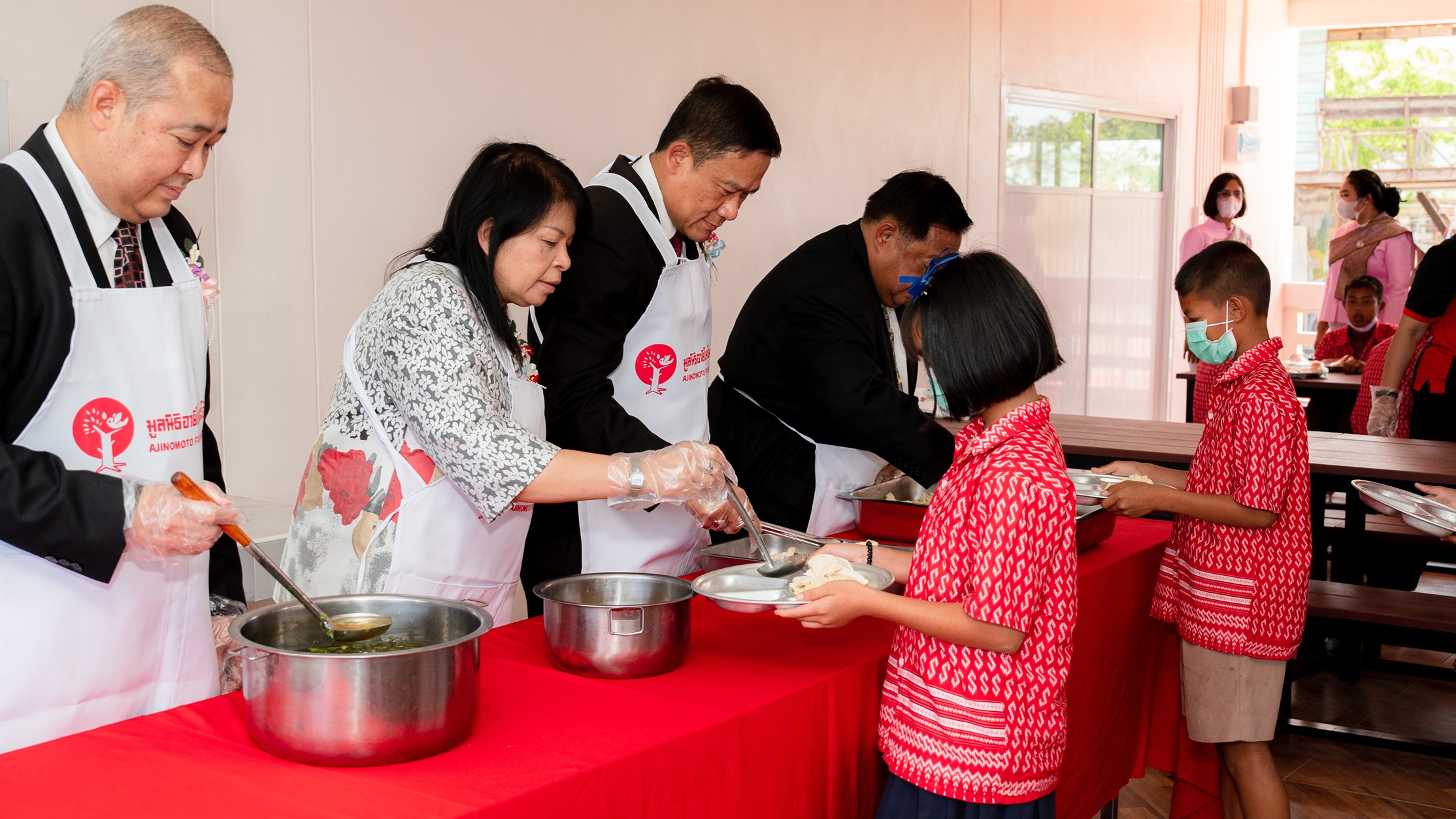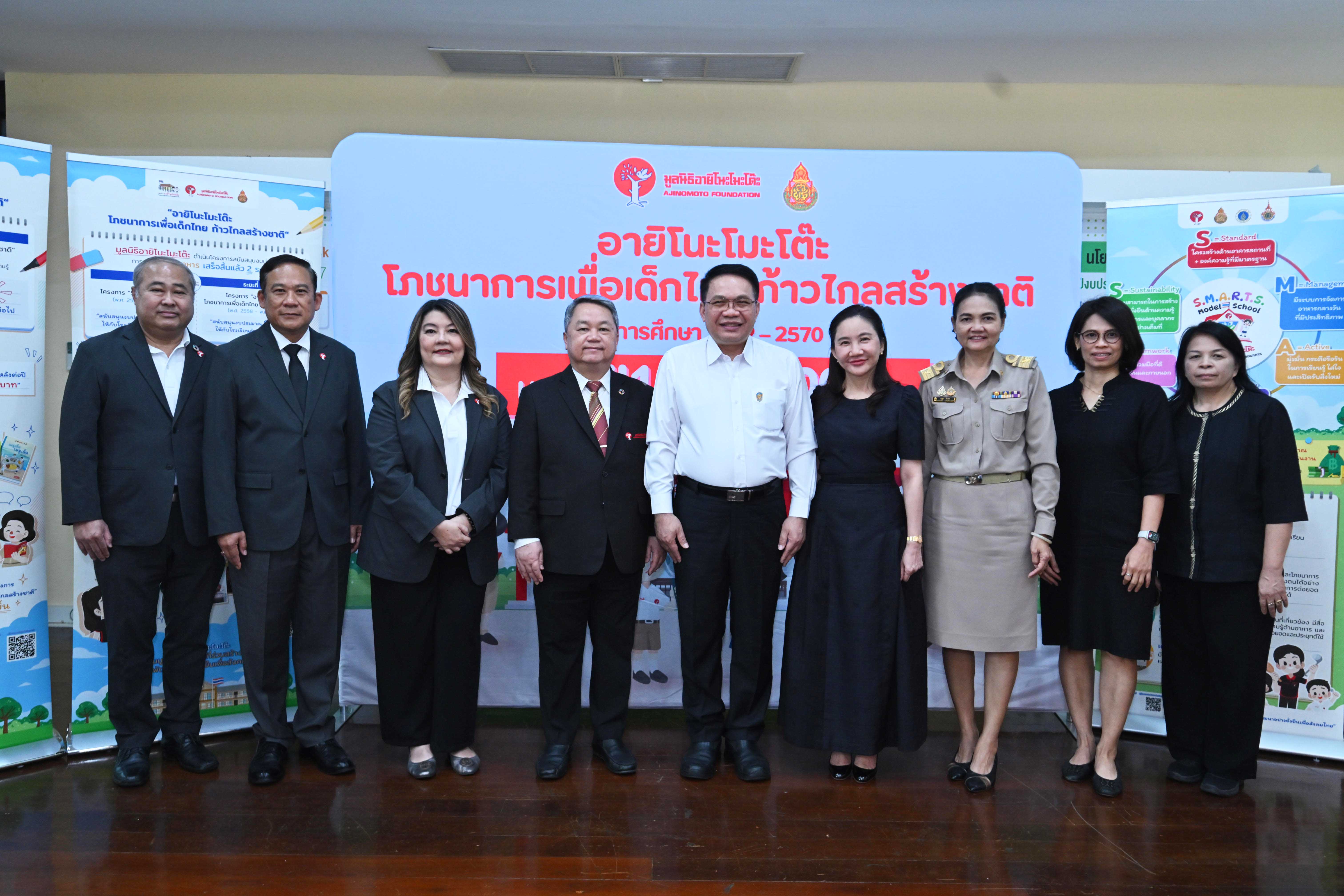 สำหรับความร่วมมือระหว่างมูลนิธิอายิโนะโมะโต๊ะและ สำนักงานคณะกรรมการการศึกษาขั้นพื้นฐาน (สพฐ.) ดำเนินงานอย่างต่อเนื่องมาตั้งแต่ปี พ.ศ. 2524 จากการสนับสนุนโครงการอาหารกลางวันและโภชนาการแก่โรงเรียนทั่วประเทศกว่า 636 แห่ง ก่อนต่อยอดสู่โครงการก่อสร้างอาคารโรงอาหารที่ได้มาตรฐาน ควบคู่กับการพัฒนาองค์ความรู้เพื่อยกระดับการจัดการอาหารกลางวันและโภชนาการในโรงเรียนให้มีประสิทธิภาพมากขึ้น ตั้งแต่ปี พ.ศ. 2553 เป็นต้นมา จนถึงปัจจุบัน มูลนิธิฯ ได้สนับสนุนงบประมาณก่อสร้างโรงอาหารแล้วกว่า 215 ล้านบาท และส่งมอบอาคารโรงอาหารมาตรฐานแล้ว 180 แห่ง ใน 77 จังหวัด ครอบคลุม 167 เขตพื้นที่การศึกษาจากทั้งหมด 183 เขตทั่วประเทศ ช่วยให้นักเรียนกว่า 50,000 คน มีสถานที่รับประทานอาหารที่สะอาด ปลอดภัย และถูกสุขลักษณะ