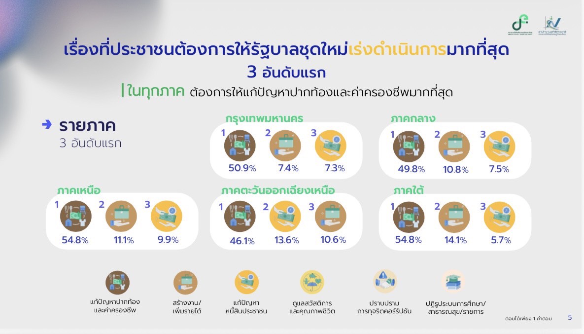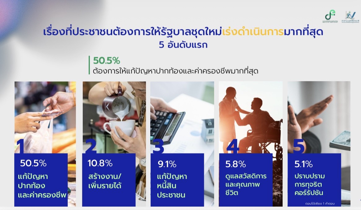 สิ่งที่อยากให้รัฐบาลชุดใหม่ควรเร่งดำเนินการ : ประชาชนตัวอย่างร้อยละ 50.5 ต้องการให้เร่งแก้ไขปัญหาปากท้องและค่าครองชีพมากที่สุด รองลงมา เช่น การสร้างงานและเพิ่มรายได้ (ร้อยละ 10.8) การแก้ไขปัญหาหนี้สินประชาชน (ร้อยละ 9.1) การดูแลสวัสดิการและคุณภาพชีวิต (ร้อยละ 5.8) และการปราบปรามการทุจริตคอร์รัปชัน (ร้อยละ 5.1) เป็นต้น