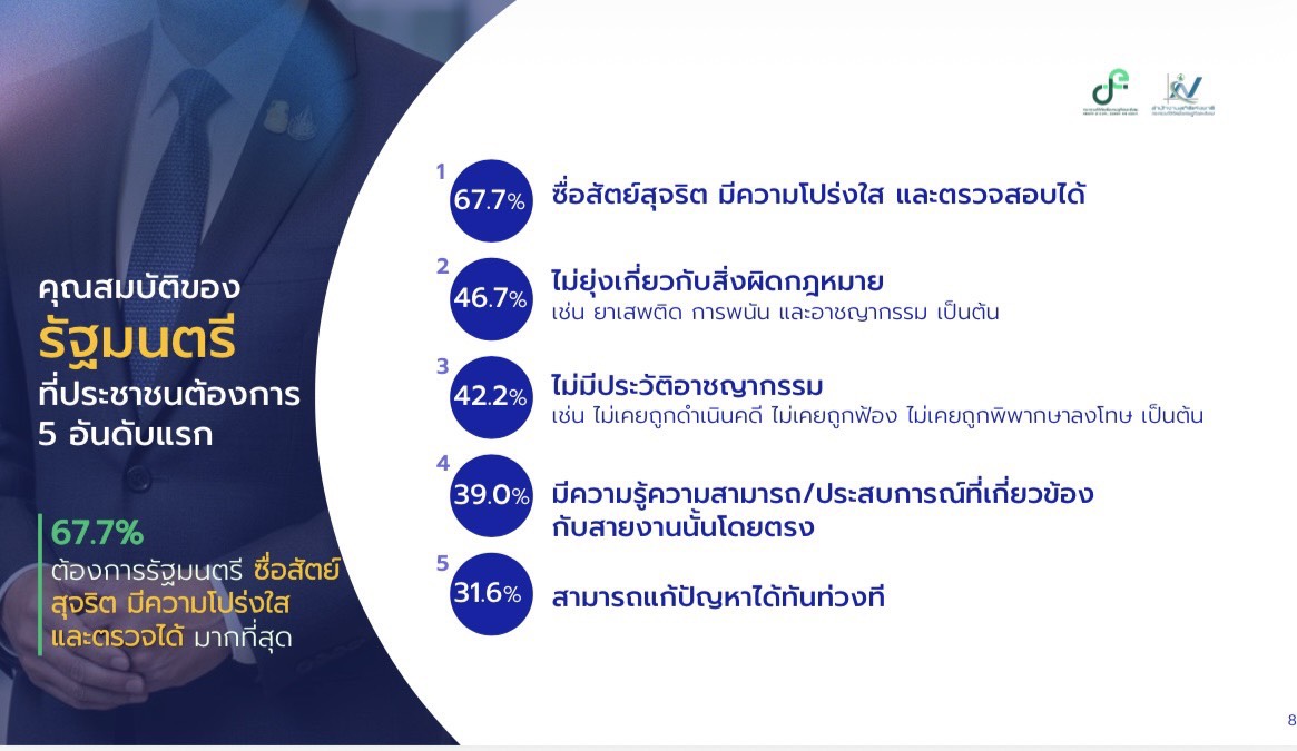 ขณะที่คุณสมบัติของรัฐมนตรีที่ประชาชนต้องการมากที่สุด คือ ความซื่อสัตย์สุจริต โปร่งใส และตรวจสอบได้ (ร้อยละ 67.7) รองลงมา เช่น ไม่ยุ่งเกี่ยวกับสิ่งผิดกฎหมาย (ร้อยละ 46.7) ไม่มีประวัติอาชญากรรม (ร้อยละ 42.2) มีความรู้ความสามารถ/ประสบการณ์ที่เกี่ยวข้องกับสายงานนั้นโดยตรง (ร้อยละ 39.0) และสามารถแก้ปัญหาได้ทันท่วงที (ร้อยละ 31.6) เป็นต้น ทั้งนี้ประชาชนตัวอย่างร้อยละ 90.4 เห็นว่า คุณสมบัติของรัฐมนตรีมีความสำคัญต่อการบริหารประเทศในระดับมากถึงมากที่สุด (มากร้อยละ 31.5 และมากที่สุดร้อยละ 58.9) สิ่งเหล่านี้สะท้อนถึงความคาดหวังต่อการทำงานของรัฐบาลชุดใหม่อย่างชัดเจน
