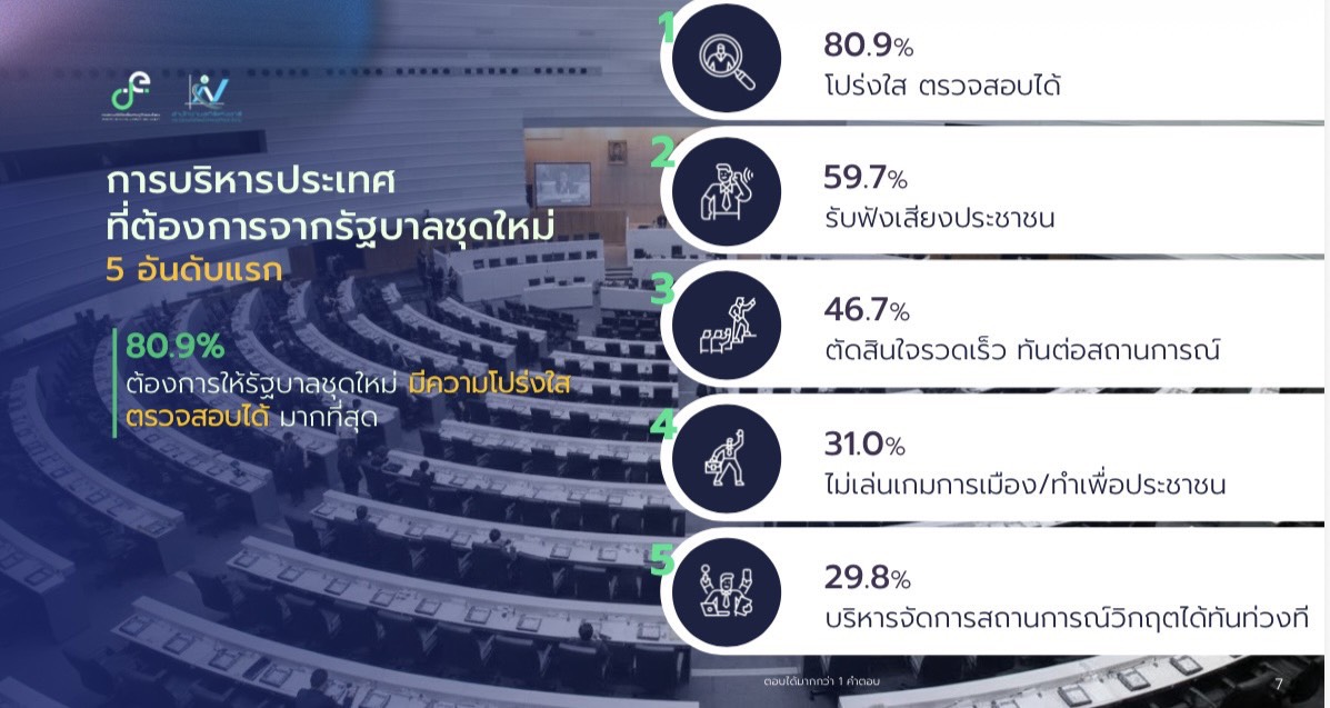 การบริหารประเทศที่ต้องการจากรัฐบาลชุดใหม่ : ประชาชนตัวอย่างร้อยละ 80.9 ต้องการให้รัฐบาลชุดใหม่บริหารประเทศด้วยความโปร่งใส ตรวจสอบได้ รองลงมา ได้แก่ รับฟังเสียงประชาชน (ร้อยละ 59.7) ตัดสินใจรวดเร็ว ทันต่อสถานการณ์ (ร้อยละ 46.7) ไม่เล่นเกมการเมือง/ทำเพื่อประชาชน (ร้อยละ 31.0) และบริหารจัดการสถานการณ์วิกฤตได้ทันท่วงที (ร้อยละ 29.8) เป็นต้น