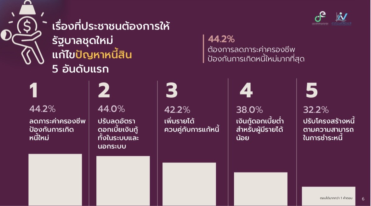 เรื่องที่ประชาชนต้องการให้รัฐบาลชุดใหม่แก้ไขปัญหาหนี้สิน : ประชาชนตัวอย่างร้อยละ 44.2 เห็นว่าควรลดภาระค่าครองชีพและป้องกันการเกิดหนี้ใหม่มากที่สุด รองลงมา เช่น ปรับลดอัตราดอกเบี้ยเงินกู้ทั้งในและนอกระบบ (ร้อยละ 44.0) เพิ่มรายได้ควบคู่กับการแก้หนี้ (ร้อยละ 42.2) เงินกู้ดอกเบี้ยต่ำสำหรับผู้มีรายได้น้อย (ร้อยละ 30.8) และปรับโครงสร้างหนี้ตามความสามารถในการชำระหนี้ (ร้อยละ 32.2) เป็นต้น