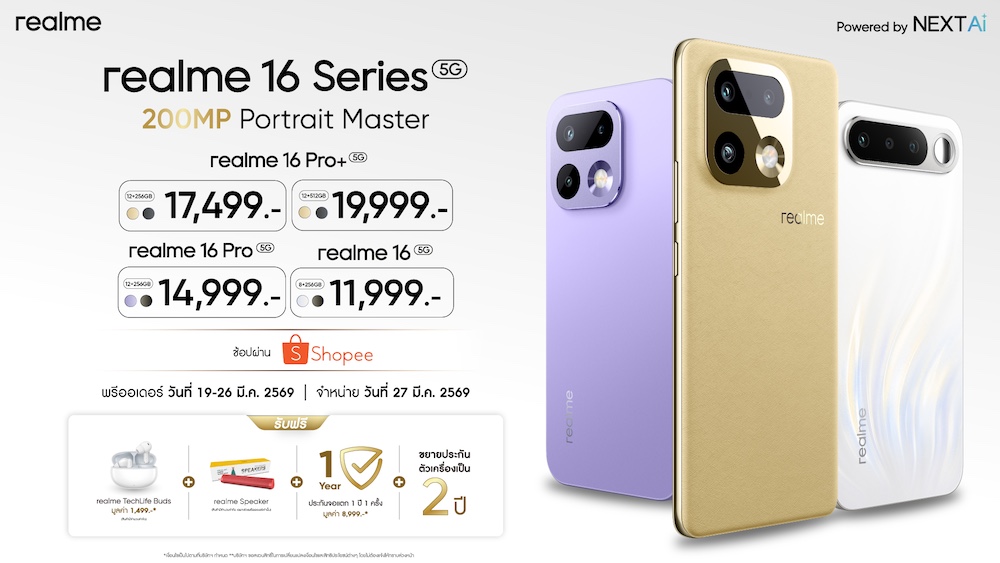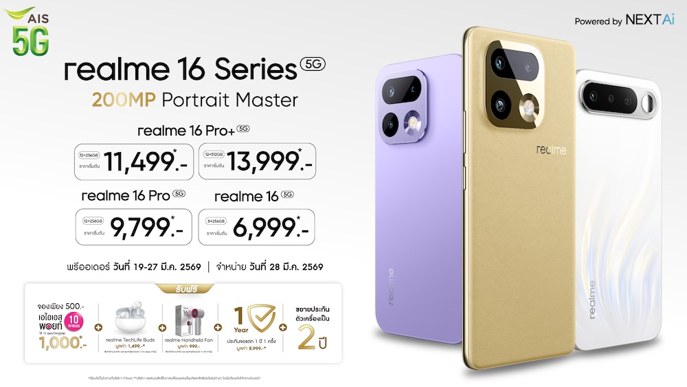 realme 16 Pro+ 5G ความจุ 12/256GB ราคาเริ่มต้น 11,499 บาท และความจุ