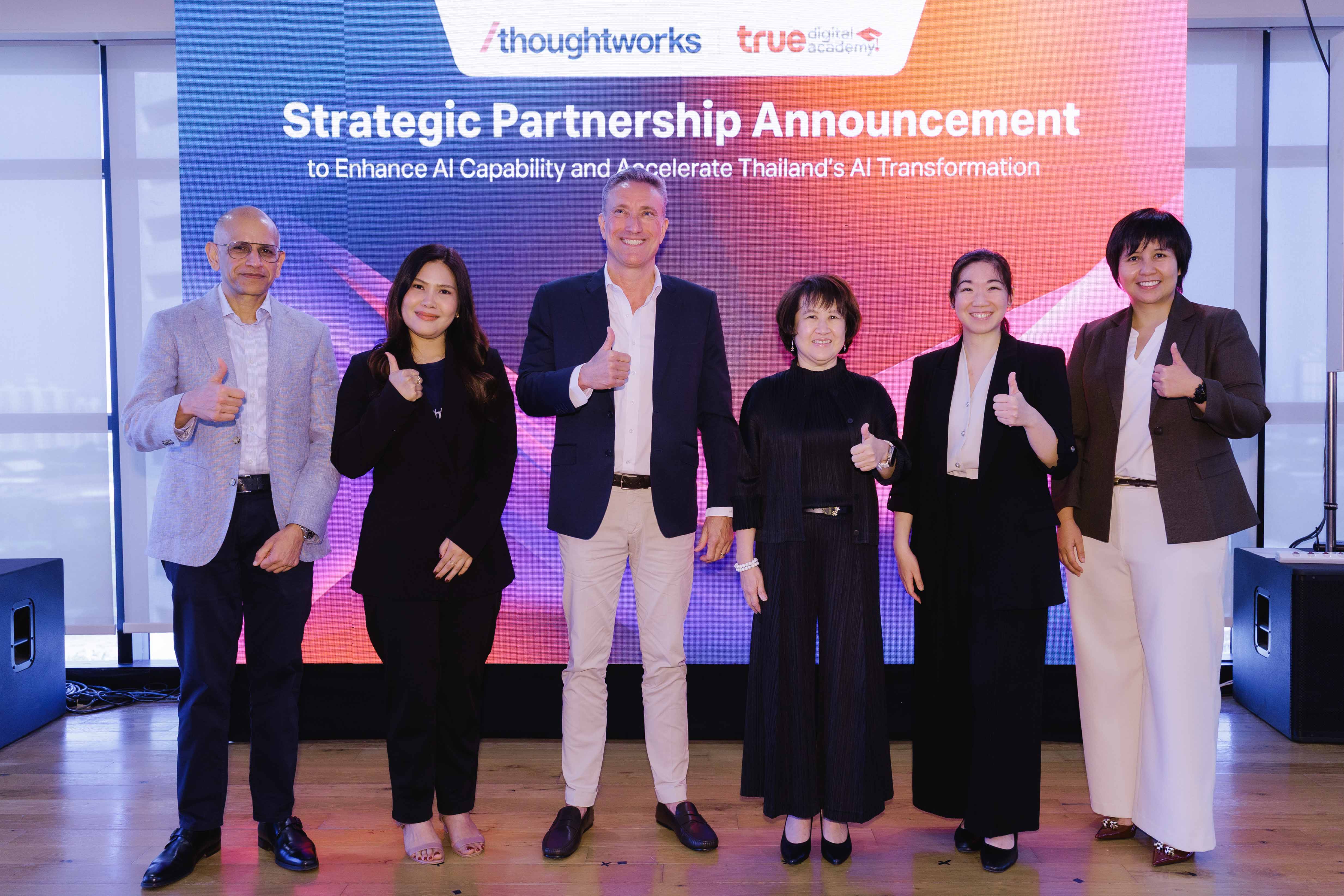 ความร่วมมือครั้งนี้ เป็นอีกหนึ่งความก้าวหน้าครั้งสำคัญของ ทรู ดิจิทัล อคาเดมี ที่จะเสริมพลังความแข็งแกร่ง เพื่อเดินหน้าพันธกิจในการพัฒนาศักยภาพด้าน AI (AI Capability) ขององค์กรในประเทศไทย ผ่านการผนึกพลังกับ Thoughtworks 3 ด้านหลัก คือ 1) การพัฒนาหลักสูตรและเนื้อหาการเรียนรู้ร่วมกัน ภายใต้มาตรฐานและการกำกับดูแลจากผู้เชี่ยวชาญของ Thoughtworks เพื่อให้เนื้อหามีความทันสมัย เชื่อมโยงกับการใช้งานในระดับองค์กร และสอดคล้องกับบริบทธุรกิจจริง โดย Thoughtworks ร่วมทบทวนและพัฒนาหลักสูตร พร้อมถ่ายทอดองค์ความรู้ทางเทคนิคเชิงลึกสู่การประยุกต์ใช้จริง 2) การเรียนรู้จากกรณีศึกษาและประสบการณ์จากโครงการจริงที่เกิดขึ้นในหลากหลายอุตสาหกรรมทั่วโลก ผสมผสานกับประสบการณ์การทำงานร่วมกับองค์กรทุกขนาดที่มีระดับความพร้อมด้าน AI ที่เเตกต่างกัน เพื่อช่วยให้องค์กรเข้าใจ เเละสามารถประยุกต์ใช้ AI เข้ากับบริบททางธุรกิจเเละ กระบวนการทำงานได้อย่างเเม่นยำ พร้อมทั้งแบ่งปันมุมมองจากผู้เชี่ยวชาญด้านเทคโนโลยีระดับโลก ที่ช่วยส่งเสริมการคิดค้นและพัฒนานวัตกรรม AI ในองค์กร และสร้างผลลัพธ์เชิงธุรกิจได้อย่างเป็นรูปธรรม และ 3) สนับสนุนการพัฒนาศักยภาพด้าน AI ขององค์กรอย่างเป็นระบบ ทำให้องค์กรสามารถขับเคลื่อนการเปลี่ยนแปลงในมิติของบุคลากร เข้าใจบทบาทสำคัญของเทคโนโลยีกับธุรกิจ เพื่อขับเคลื่อน AI Transformation อย่างยั่งยืน โดยเน้นยำเรื่องวัฒนธรรมความปลอดภัย เเละการให้มนุษย์เป็นศูนย์กลาง เชื่อมการเรียนรู้สู่การใช้งานจริง เตรียมความพร้อมในการสร้าง บริหาร และขยายระบบ AI ในระดับองค์กร