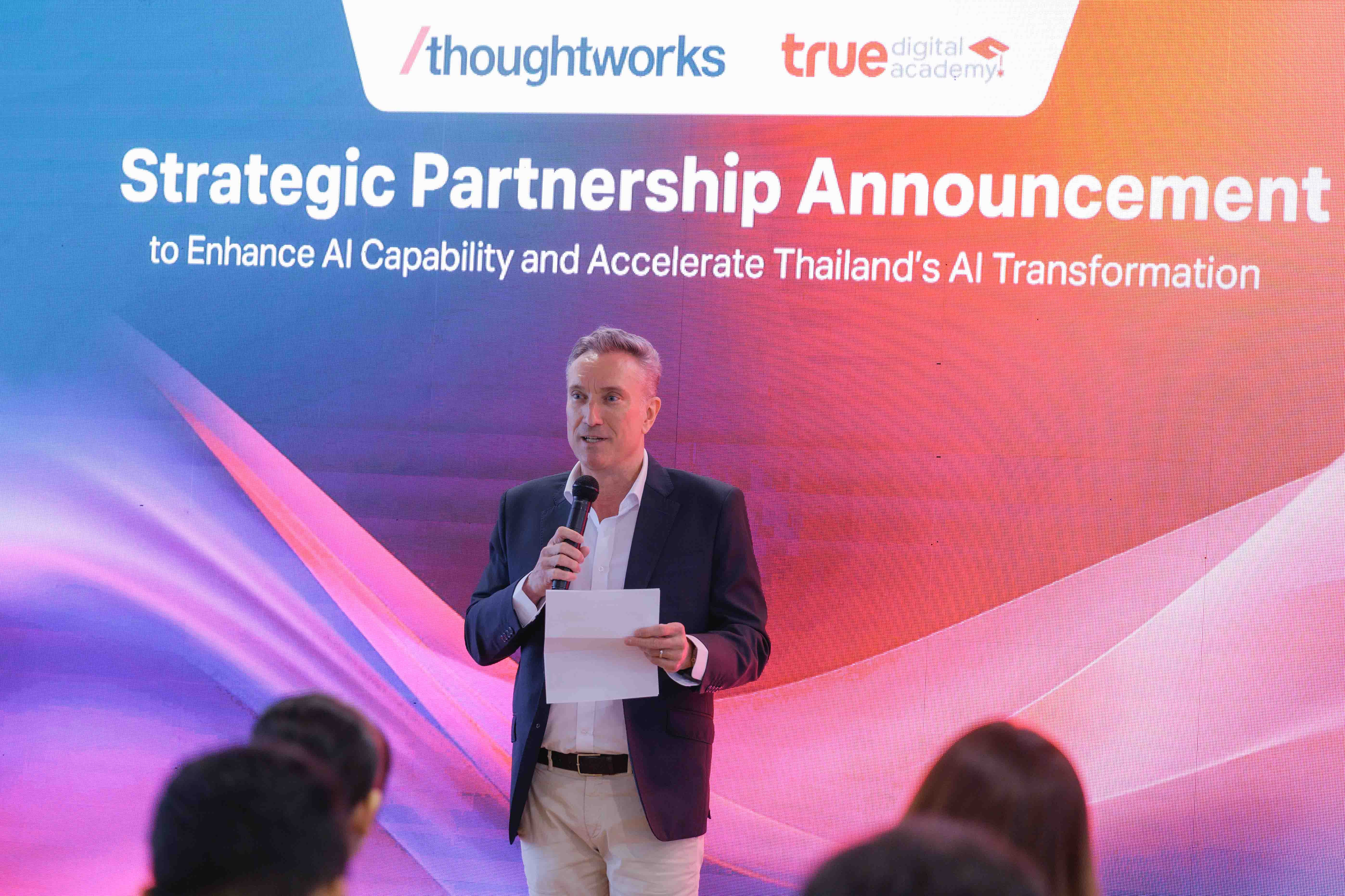 ด้วยการรวมพลังระหว่าง ทรู ดิจิทัล อคาเดมี ผู้นำด้านการพัฒนาบุคลากร และความเชี่ยวชาญทางวิศวกรรมแบบครบวงจรของ Thoughtworks เราพร้อมเป็นแรงขับเคลื่อนในการสร้างบุคลากรที่มีทักษะตอบโลกอนาคต และนวัตกรรมบริการด้านเทคโนโลยีที่ทันสมัย เพื่อผลักดันเศรษฐกิจดิจิทัลของไทยให้ก้าวไปข้างหน้า เป้าหมายร่วมกันของเราคือ การเปลี่ยนผ่านจากภาคทฤษฎีไปสู่แนวปฏิบัติที่เห็นผลชัดเจน ยกระดับศักยภาพแรงงานไทยด้าน AI สู่มาตรฐานสากล และการขับเคลื่อนองค์กรไทยสู่ AI Adoption และการเป็น AI-First Organization ได้อย่างเป็นรูปธรรมและขยายผลได้จริงสร้างการเปลี่ยนแปลงที่ส่งผลต่อการพัฒนาประเทศอย่างยั่งยืน”