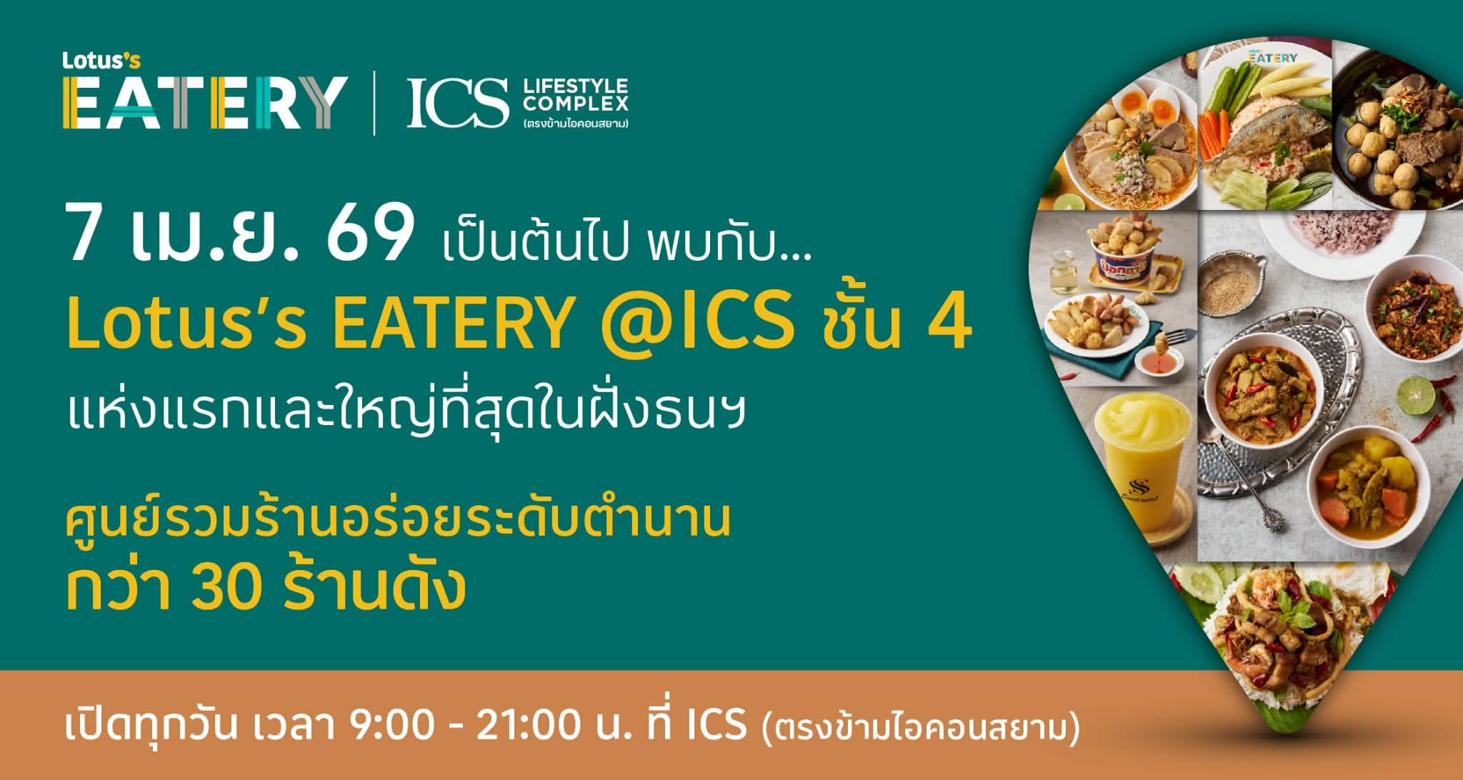ไอซีเอส ผนึกกำลัง “Lotus’s Eatery” เปิดศูนย์รวมร้านอาหารดังระดับตำนานกว่า 30 ร้าน สร้าง Food Destination แห่งใหม่ของฝั่งธนบุรี ตอบกลยุทธ์การสร้างเมืองของไอคอนสยามอย่างสมบูรณ์แบบ พร้อมเดินเกมรุก Food Ecosystem ส่งผลขยายฐานลูกค้าครบเซ็กเมนต์ ฉลองเปิดร้าน 7 เม.ย. 2569 นี้ จัดแคมเปญยิ่งใหญ่ แจกสิทธิ์ทานอาหารฟรี 5,000 สิทธิ์ สิทธิ์ละ 200 บาท ที่ “Lotus’s Eatery @ ICS”
