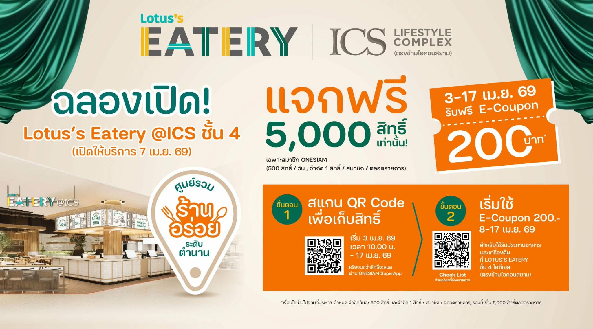 ไอซีเอสและ Lotus’s Eatery ได้จัดแคมเปญพิเศษ เพื่อฉลองการเปิดตัว โดยมอบคูปองรับประทานอาหารฟรี! มูลค่า 200 บาท รวมทั้งสิ้น 5,000 สิทธิ์ มูลค่ารวม 1,000,000 บาท (จำกัด 500 สิทธิ์ต่อวัน และ 1 สิทธิ์ต่อสมาชิกวันสยาม) เพียงกดรับสิทธิ์ผ่าน ONESIAM SuperApp ระหว่างวันที่ 3 – 17 เมษายน 2569 หรือจนกว่าจำนวนสิทธิ์จะหมด (เริ่มกดรับสิทธิ์วันแรก 3 เม.ย. 2569 เวลา 10.00 น.) และท่านที่ได้รับสิทธิ์สามารถนำคูปองมาแลก การ์ด Lotus’s Eatery เพื่อใช้สิทธิ์ทานอาหารฟรีได้ตามวันที่ระบุในคูปองเท่านั้น เริ่มใช้คูปองได้ตั้งแต่วันที่ 8 – 17 เมษายน 2569