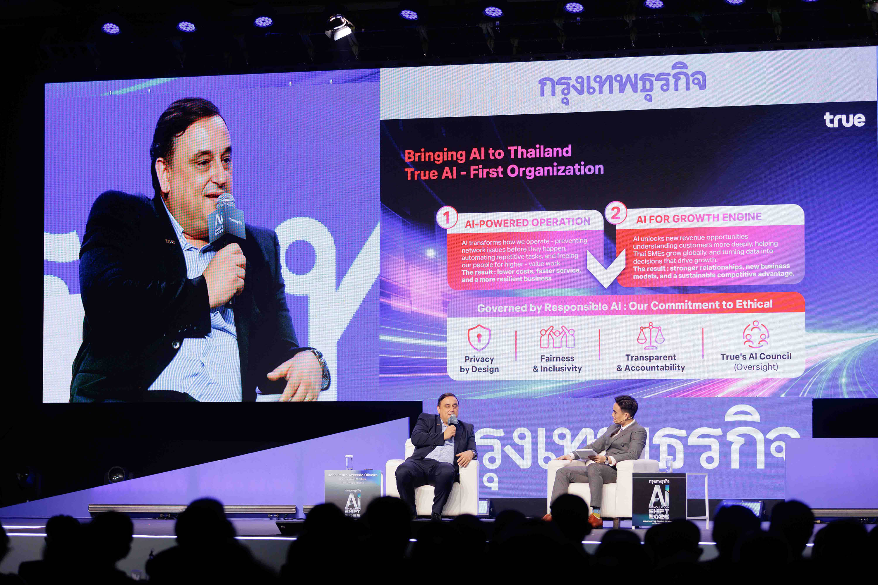 แต่คือ “คน” ทรูให้ความสำคัญกับการพัฒนาทุนมนุษย์ (Human Capital) อย่างต่อเนื่อง โดยเฉพาะการยกระดับทักษะด้าน AI ให้กับพนักงานทั่วทั้งองค์กร เพื่อให้ทุกคนสามารถนำ AI ไปใช้ได้จริงในงานของตนเอง ควบคู่กับการเสริมศักยภาพและโอกาสในการเติบโตของแต่ละบุคคลในยุคดิจิทัล