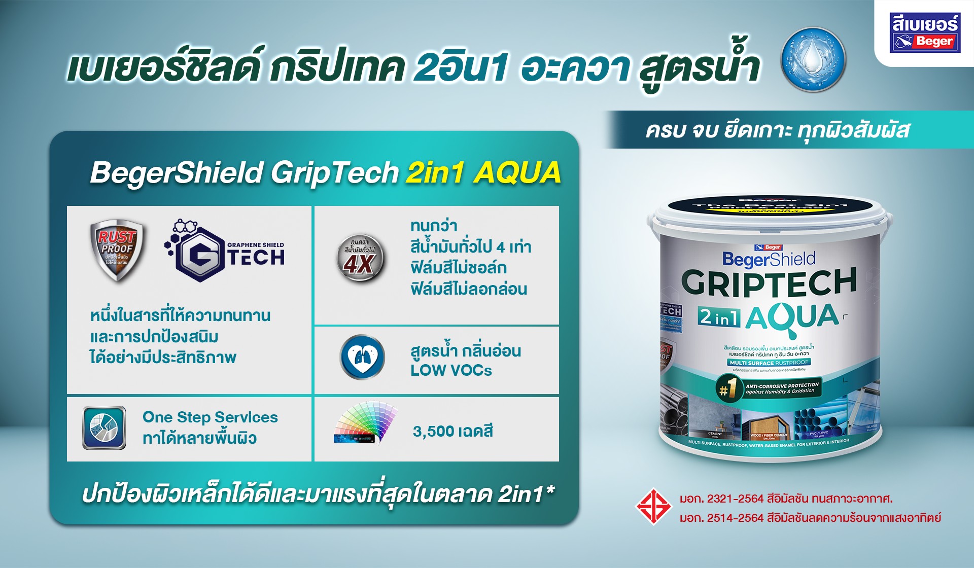 นอกจากนี้ BegerShield Griptech 2in1 ยังมาพร้อมเทคโนโลยี Multi-Surface Coating ที่สามารถยึดเกาะได้ดีบนพื้นผิวหลากหลายประเภท ไม่ว่าจะเป็นเหล็ก อะลูมิเนียม สแตนเลส เหล็กชุบกัลวาไนซ์ รวมถึงวัสดุอย่าง PVC, UPVC และคอนกรีต รองรับทั้งงานโครงสร้าง งานซ่อมแซม และงานตกแต่งได้ในผลิตภัณฑ์เดียว อีกทั้งยังรองรับระบบผสมสีมากกว่า 3,500 เฉดสี เพิ่มความยืดหยุ่นด้านการออกแบบสำหรับสถาปนิกและนักพัฒนาโครงการ