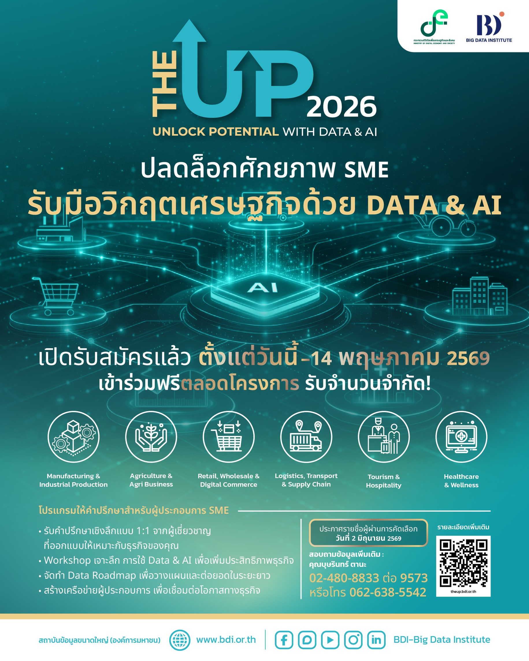 สถาบันข้อมูลขนาดใหญ่ (องค์การมหาชน) หรือ BDI เดินหน้าขับเคลื่อนโครงการ "The UP 2026: Unlock Potential with Data & AI - ปลดล็อกศักยภาพ SME ไทย รับมือวิกฤตเศรษฐกิจด้วย Data & AI" ต่อเนื่องเป็นปีที่ 3 สะท้อนพันธกิจหลักของ BDI ในฐานะองค์กรที่ขับเคลื่อนประเทศด้วยข้อมูลขนาดใหญ่ที่มุ่งเปลี่ยน "ข้อมูล" ให้กลายเป็น "ความได้เปรียบทางธุรกิจ" ท่ามกลางภาวะเศรษฐกิจที่มีความผันผวนสูง เปิดรับสมัคร SME เข้าร่วมโครงการ ฟรี! ได้แล้วตั้งแต่วันนี้ - 14 พฤษภาคม 2569 เท่านั้น!