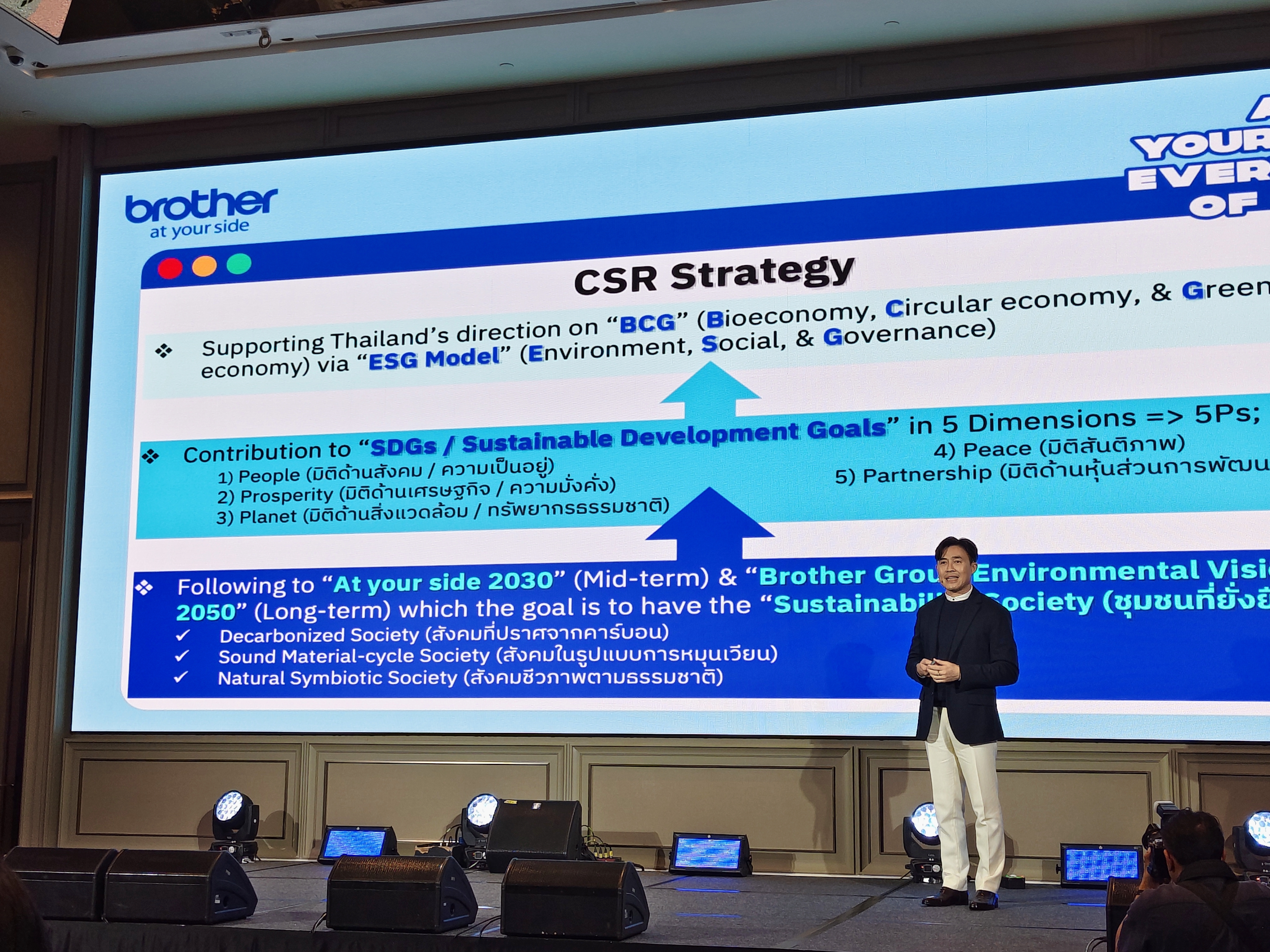 พรภัค อุไพศิลป์สถาพร ผู้จัดการทั่วไปฝ่ายการเงินและการบริหาร กล่าวว่า บราเดอร์ยังให้ความสำคัญอย่างสูงสุดกับมิติของสังคมและสิ่งแวดล้อมภายใต้โมเดล ESG และ BCG โดยมีพันธสัญญา “At Your Side 2030” และวิสัยทัศน์สิ่งแวดล้อมปี 2050 ที่มุ่งสู่ความยั่งยืน