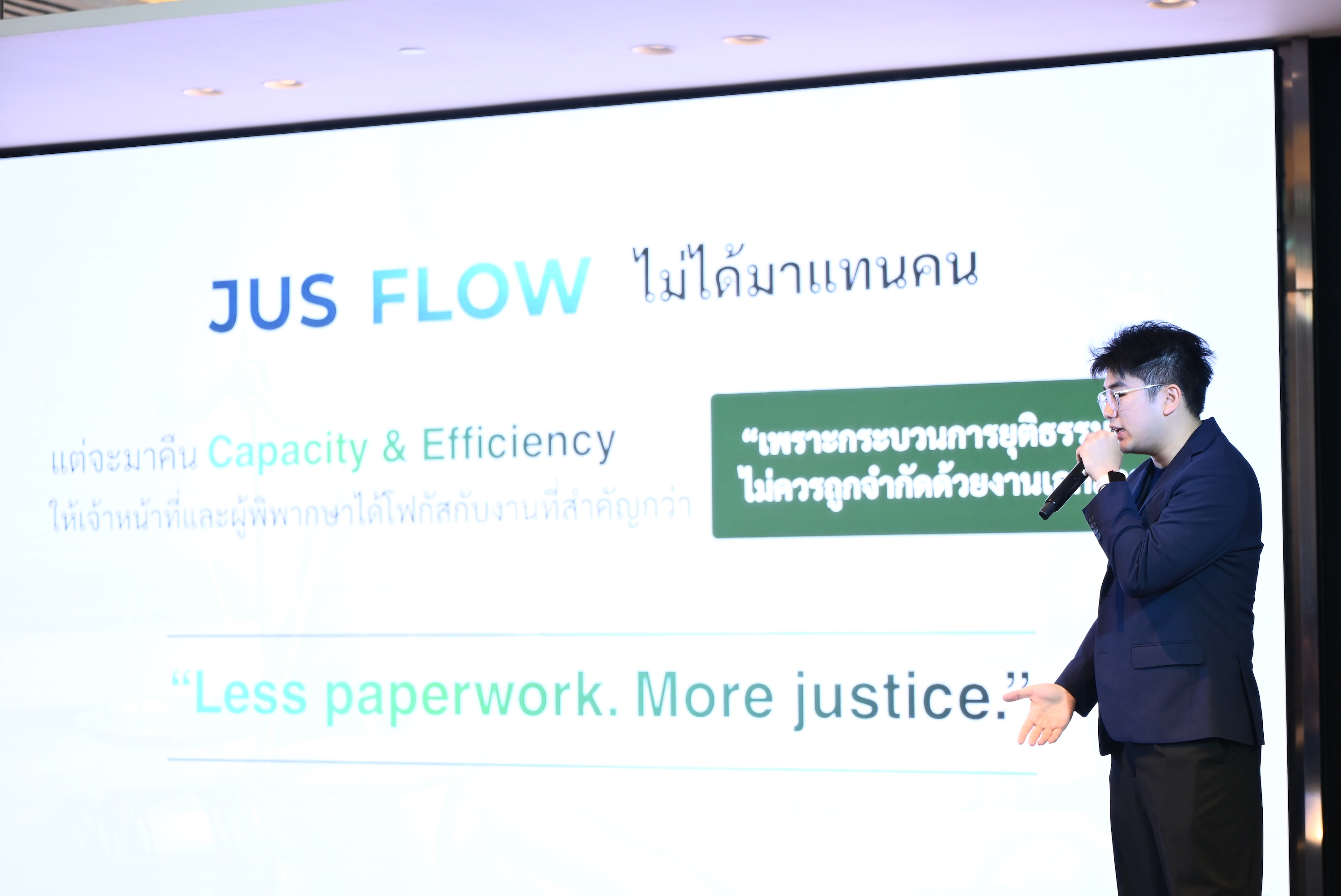 สำหรับการแข่งขันในรอบชิงชนะเลิศนี้ เป็นการประชันไอเดียของ 10 ทีมสุดท้าย ที่ผ่านกระบวนการคัดเลือกจาก 74 ทีม และบ่มเพาะอย่างเข้มข้นผ่านมาทั้งกิจกรรม Orientation และ Intensive Workshop โดยได้รับคำแนะนำอย่างใกล้ชิดจากผู้เชี่ยวชาญทั้งด้านเทคโนโลยี AI Infrastructure และผู้เชี่ยวชาญจากหน่วยงานในกระบวนการยุติธรรมตัวจริง เพื่อให้ผู้เข้าแข่งขันเข้าใจถึง Pain Point และข้อจำกัดในการทำงาน จนนำมาสู่การพัฒนาต้นแบบนวัตกรรมที่สามารถตอบโจทย์การทำงานจริงได้ใน 4 ด้านสำคัญ ไม่ว่าจะเป็นการออกแบบ AI เพื่อช่วยให้ประชาชนเข้าถึงข้อมูลและแนวปฏิบัติในการเข้าสู่กระบวนการยุติธรรมได้ง่ายขึ้น การช่วยประชาชนให้สามารถดำเนินกระบวนการทางศาลด้วยตนเองได้อย่างถูกต้อง การพัฒนาเครื่องมือสนับสนุนให้บุคลากรในกระบวนการยุติธรรมเข้าถึงข้อมูลการพิจารณาคดีได้อย่างรวดเร็วแม่นยำ ตลอดจนการใช้ AI เข้ามาช่วยลดภาระงานที่มีความซ้ำซ้อนเพื่อเพิ่มประสิทธิภาพการทำงานในภาพรวม
