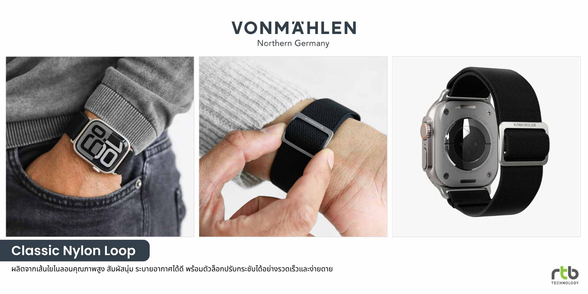 • VONMÄHLEN Classic Nylon Loop สายสำหรับ Apple Watch ที่ออกแบบมาเพื่อความสบายในการสวมใส่ตลอดทั้งวัน ผลิตจากวัสดุไนลอนที่ยืดหยุ่นและนุ่มเป็นพิเศษ ช่วยระบายอากาศและความร้อนได้ดี ทำให้ข้อมือแห้งสบาย ไม่อับชื้น เหมาะสำหรับทุกกิจกรรมในชีวิตประจำวัน พร้อมเติมเต็มทุกสไตล์ไม่ว่าจะเป็นลุคแคชวลหรือทางการ มาพร้อมตัวล็อกแบบเลื่อนที่ช่วยให้ปรับขนาดสายได้ง่ายและกระชับพอดีกับข้อมือ รองรับ Apple Watch ขนาด 40/41/42mm และ 44/45/46/49mm มีให้เลือกหลายสี ได้แก่ Black, All Black, Cream, Cream Black, Navy, Navy Black, Olive และ Olive Black วางจำหน่ายในราคา 890 บาท