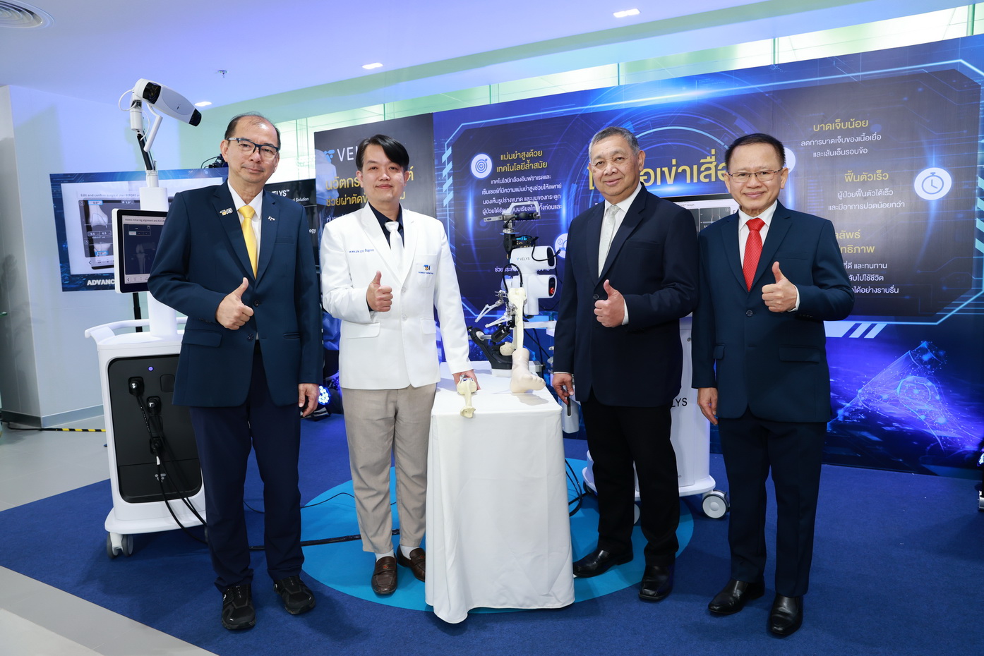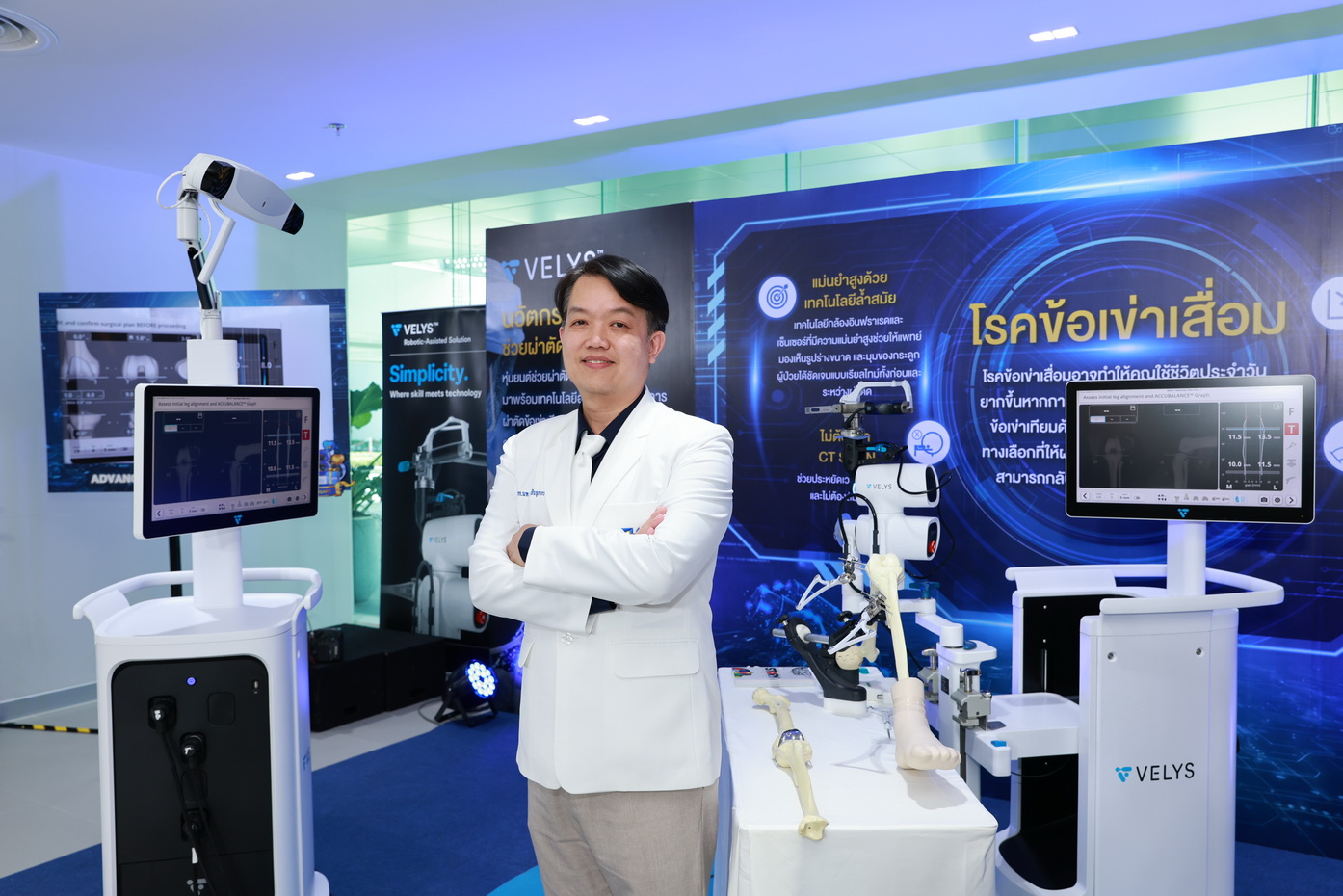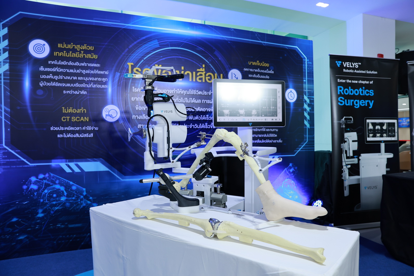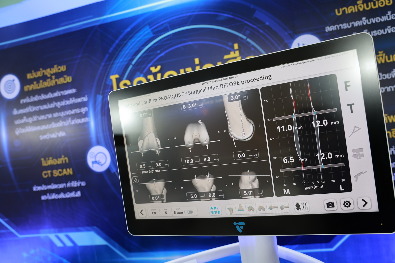 การนำนวัตกรรม VELYS™ Robot-Assisted Solution มาใช้ ถือเป็นการตอบโจทย์ผู้ป่วยยุคใหม่ได้อย่างสมบูรณ์แบบ เทคโนโลยีหุ่นยนต์นี้ให้ความแม่นยำสูงสุดภายใต้การควบคุมของศัลยแพทย์ผู้เชี่ยวชาญ จุดเด่นที่สำคัญคือ สามารถประมวลผลสร้างภาพ 3 มิติแบบ Real-time ในห้องผ่าตัดได้ทันที โดยไม่ต้องทำ CT Scan ล่วงหน้า ช่วยให้แพทย์สามารถวางแผนและจัดวางตำแหน่งข้อเข่าเทียมให้เข้ากับระนาบขาและสรีระของผู้ป่วยแต่ละรายได้อย่างสมดุล