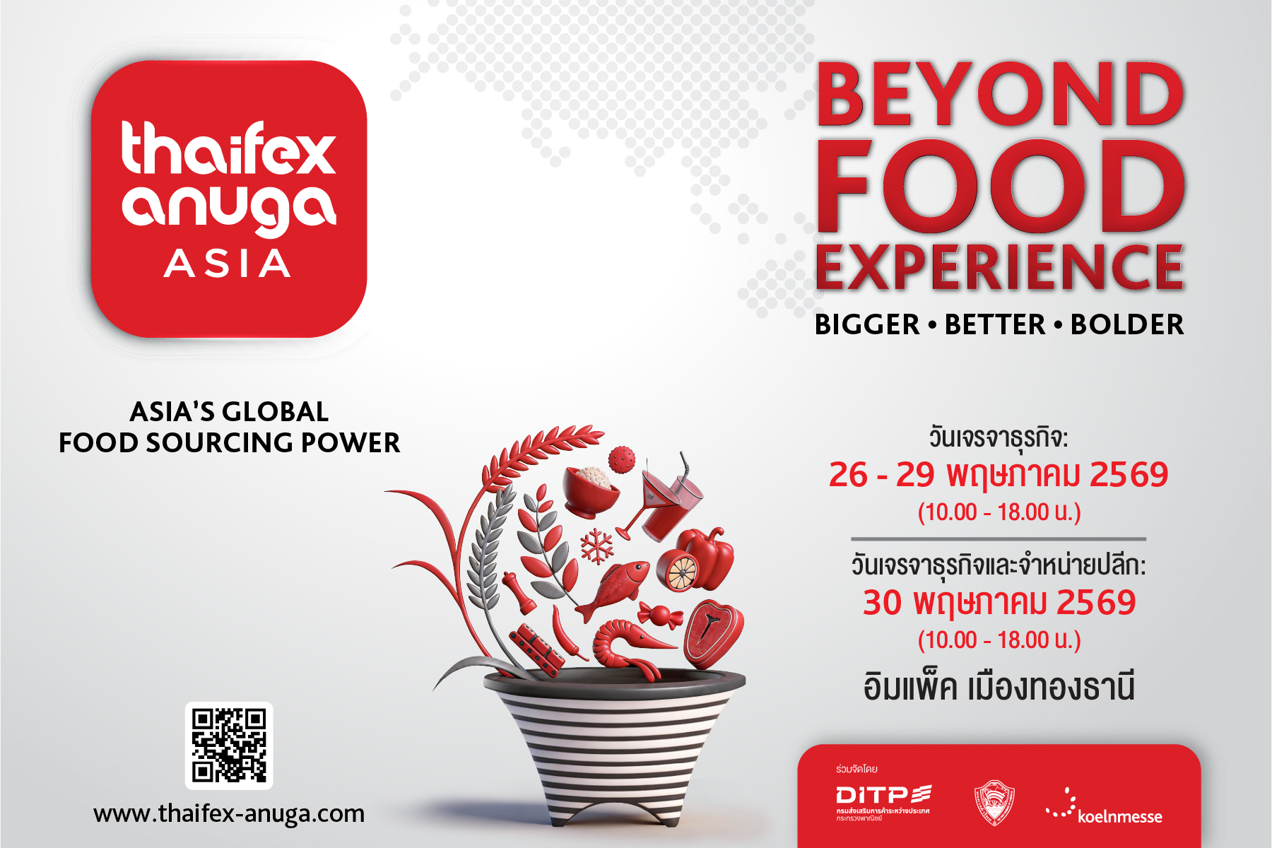 THAIFEX - ANUGA ASIA 2026 กำหนดจัดขึ้นระหว่างวันที่ 26-30 พฤษภาคม 2569 ณ อิมแพ็ค ชาเลนเจอร์ อาคาร 1-3, อิมแพ็ค ฟอรั่ม อาคาร 4, อิมแพ็ค เอ็กซิบิชั่น เซ็นเตอร์ อาคาร 5-12 ศูนย์แสดงสินค้าและการประชุมอิมแพ็ค เมืองทองธานี โดยเปิดเจรจาธุรกิจวันที่ 26-30 พฤษภาคม 2569 เวลา 10.00 – 18.00 น. และในวันที่ 30 พฤษภาคม 2569 เปิดจำหน่ายปลีกสำหรับประชาชนทั่วไป เวลา 10.00 – 20.00 น. ผู้สนใจสอบถามข้อมูลเพิ่มเติมได้ที่ กรมส่งเสริมการค้าระหว่างประเทศ โทร.1169 และสามารถลงทะเบียนล่วงหน้าเพื่อความสะดวกในการเข้าชมงานได้ที่ https://registration.thaifex-anuga.com/s/OAlRMg