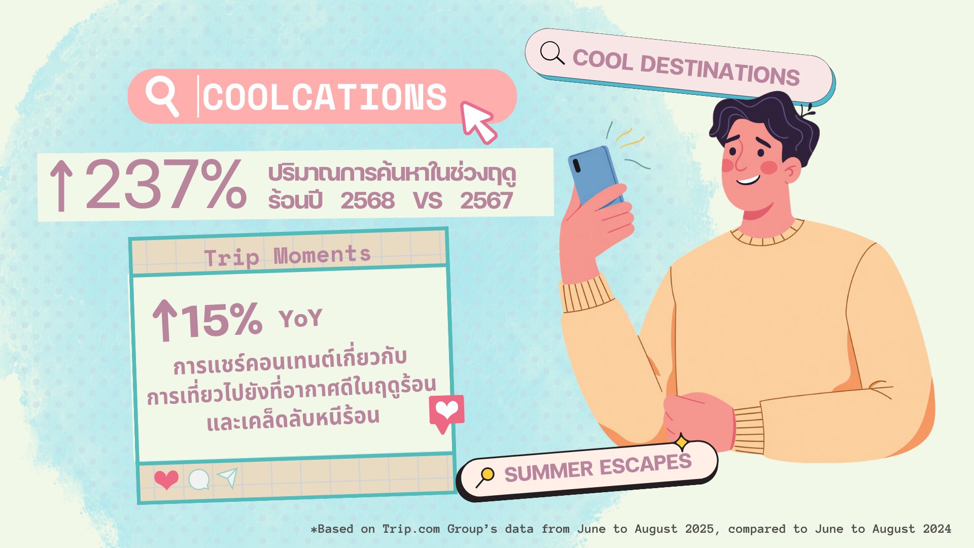 นอกจากนี้ แพลตฟอร์ม Trip Moments ของ Trip.com ซึ่งเป็นคอมมูนิตี้สำหรับนักท่องเที่ยวที่ผู้ใช้งาน Trip.com ต่างมาร่วมแชร์ประสบการณ์และแรงบันดาลใจในการท่องเที่ยว ยังพบว่าคอนเทนต์เกี่ยวกับจุดหมายปลายทางอากาศเย็นในช่วงหน้าร้อน และเทคนิคการ “หนีร้อน” เติบโตขึ้น 15.4% เมื่อเทียบกับปีก่อน [3] โดยคีย์เวิร์ดสำคัญอย่างคำว่า “หนีร้อน”, “Summer Escape” และ “ที่เที่ยวอากาศดีช่วงหน้าร้อน” ได้รับความสนใจมากเป็นพิเศษ สะท้อนให้เห็นว่านักท่องเที่ยวให้ความสำคัญกับประสบการณ์การเดินทางที่หลีกหนีความแออัดและอากาศที่ร้อนอบอ้าว
