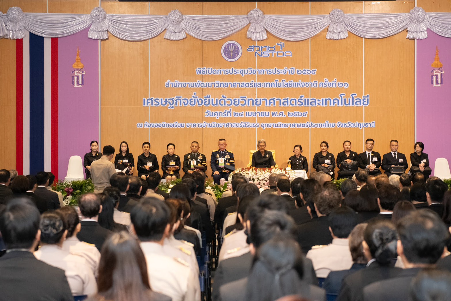 เมื่อวันที่ 24 เมษายน 2569 เวลา 09.00 น. ณ อาคารบ้านวิทยาศาสตร์สิรินธร อุทยานวิทยาศาสตร์ประเทศไทย อ.คลองหลวง จ.ปทุมธานี: สมเด็จพระกนิษฐาธิราชเจ้า กรมสมเด็จพระเทพรัตนราชสุดา ฯ สยามบรมราชกุมารี เสด็จพระราชดำเนินทรงเปิดงานประชุมวิชาการประจำปี 2569 ของสำนักงานพัฒนาวิทยาศาสตร์และเทคโนโลยีแห่งชาติ (สวทช.) ครั้งที่ 21 หรือ NAC2026 ซึ่งจัดขึ้นระหว่างวันที่ 24-28 เมษายน 2569 ณ อุทยานวิทยาศาสตร์ประเทศไทย อ.คลองหลวง จ.ปทุมธานี ภายใต้แนวคิด “เศรษฐกิจยั่งยืนด้วยวิทยาศาสตร์และเทคโนโลยี” (Sustainable Economy through Science and Technology) โดยมีผู้เฝ้ารับเสด็จฯ ประกอบด้วย ศาสตราจารย์ยศชนัน วงศ์สวัสดิ์ รองนายกรัฐมนตรี และรัฐมนตรีว่าการกระทรวงการอุดมศึกษา วิทยาศาสตร์ วิจัยและนวัตกรรม (อว.) ทยุฏ วงษ์พิทักษ์โรจน์ ผู้พิพากษาหัวหน้าศาลจังหวัดธัญบุรี พลตรี ลิฐิจักษ์ ร่มโพธิ์ชี ผู้บัญชาการมณฑลทหารบกที่ 11 พลตำรวจตรี พีรพล โชติกเสถียร ผู้บังคับการตำรวจภูธรจังหวัดปทุมธานี ศาสตราจารย์ศุภชัย ปทุมนากุล ปลัดกระทรวง อว. ศาสตราจารย์ชูกิจ ลิมปิจำนงค์ ผู้อำนวยการสำนักงานพัฒนาวิทยาศาสตร์และเทคโนโลยีแห่งชาติ รองศาสตราจารย์เติมศักดิ์ ศรีศิรินทร์ ผู้อำนวยการศูนย์เทคโนโลยีโลหะและวัสดุแห่งชาติ พร้อมด้วย คณะกรรมการพัฒนาวิทยาศาสตร์และเทคโนโลยีแห่งชาติ พร้อมอดีตผู้บริหาร สวทช. และผู้บริหารระดับสูง อาทิ อธิบดีกรมสรรพากร อธิบดีกรมควบคุมโรค อธิบดีกรมทรัพยากรทางทะเลและชายฝั่ง เฝ้ารับเสด็จฯ