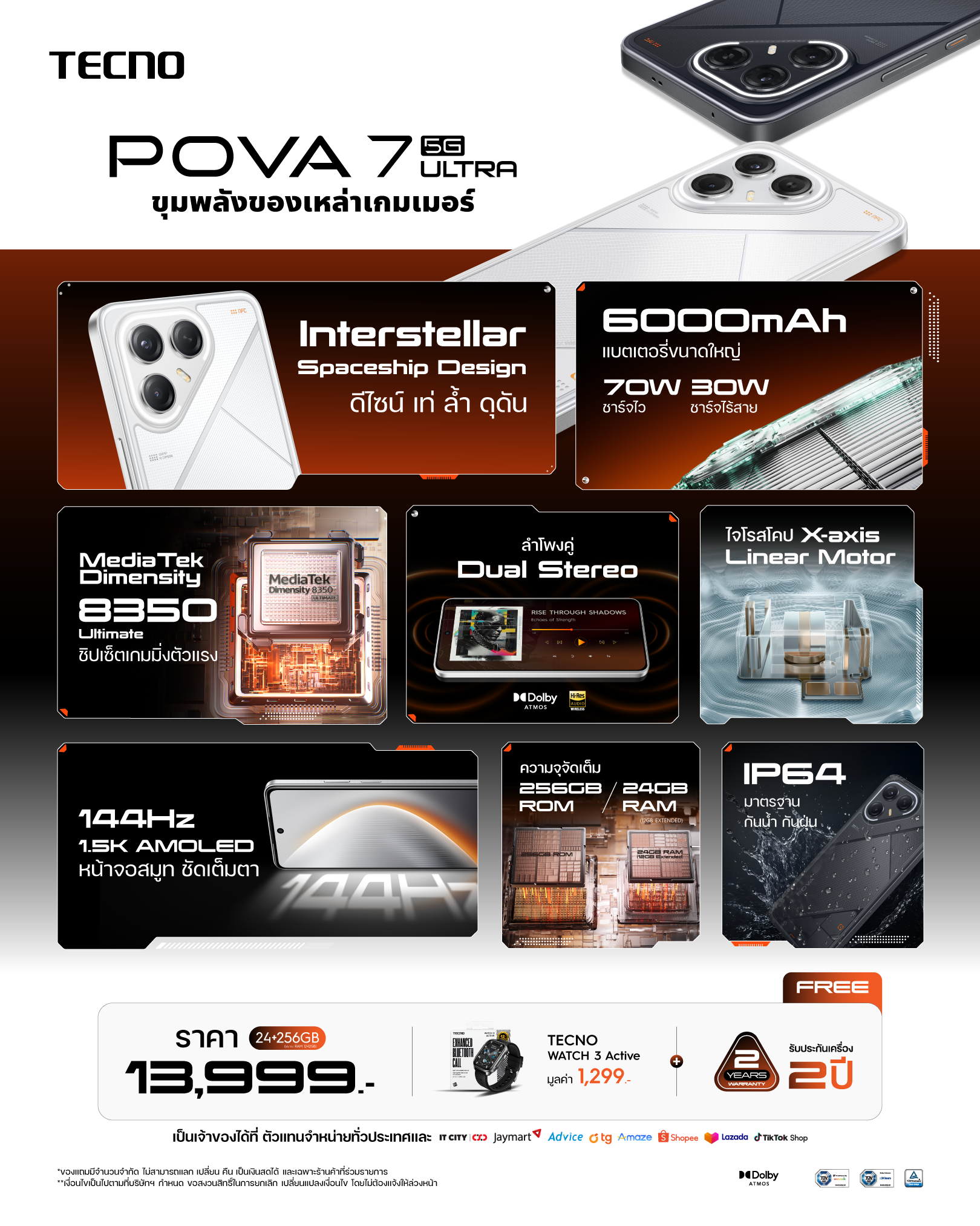 ในราคาสุดคุ้มค่าเพียง 13,999 บาท พิเศษสุด! สำหรับช่วงเปิดตัว * รับฟรีทันที! สมาร์ทวอทช์ TECNO Active Watch 3 มูลค่า 1,299 บาท และ อุ่นใจยิ่งขึ้นด้วย การรับประกันตัวเครื่องยาวนานถึง 2 ปี
