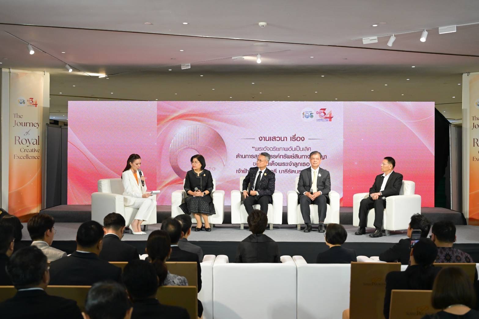 นอกจากนี้ ไปรษณีย์ไทยยังได้ร่วมเสวนาในหัวข้อ “พระอัจฉริยภาพอันเป็นเลิศด้านการสร้างสรรค์ทรัพย์สินทางปัญญา” โดยมีผู้ทรงคุณวุฒิจากหลากหลายภาคส่วนเข้าร่วม อาทิ ผู้แทนจากกรมทรัพย์สินทางปัญญา สถาบันส่งเสริมศิลปหัตถกรรมไทย สถาบันการศึกษา และภาคเอกชน เพื่อร่วมสะท้อนมุมมองการพัฒนาเศรษฐกิจสร้างสรรค์และการใช้ทรัพย์สินทางปัญญาเป็นเครื่องมือขับเคลื่อนประเทศ