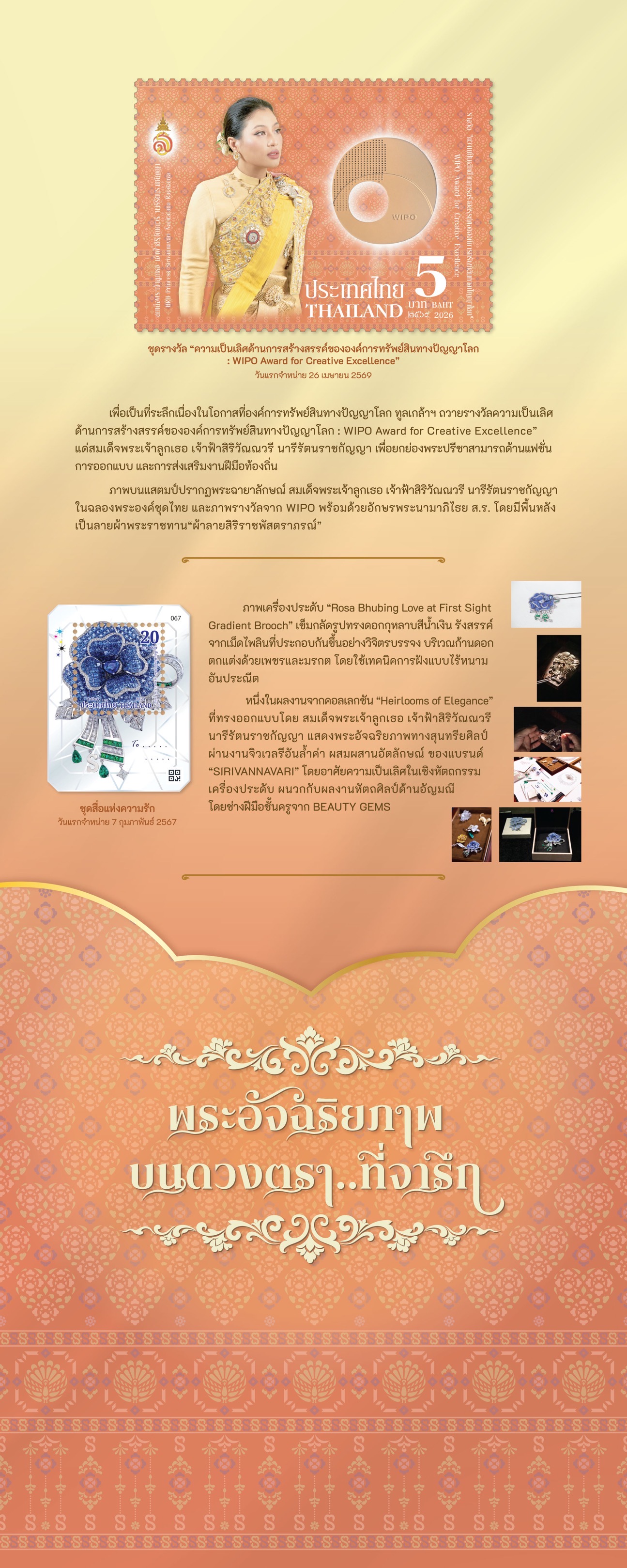 บริษัท ไปรษณีย์ไทย จำกัด ร่วมกับกรมทรัพย์สินทางปัญญา จัดแสดงแสตมป์ที่ระลึกเฉลิมพระเกียรติสมเด็จพระเจ้าลูกเธอ เจ้าฟ้าสิริวัณณวรี นารีรัตนราชกัญญา “WIPO Award for Creative Excellence” ซึ่งเป็นการยอมรับในระดับนานาชาติด้านความคิดสร้างสรรค์ และสะท้อนพระอัจฉริยภาพอันโดดเด่นในฐานะผู้นำทางวัฒนธรรมร่วมสมัยของไทย ในงานนิทรรศการเปิดตัวตราไปรษณียากรเฉลิมพระเกียรติสมเด็จเจ้าฟ้าสิริวัณณวรีฯ โดยมี ศุภจี สุธรรมพันธุ์ รองนายกรัฐมนตรี และรัฐมนตรีว่าการกระทรวงพาณิชย์เป็นประธานในพิธิเปิด